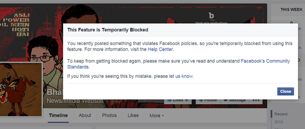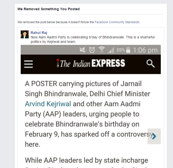 Exhibit B. Rahul Raj, the man behind the very popular Facebook page Bhak Sala (and also a key custodian of OpIndia, in the spirit of complete disclosure), reposts something by Indian Express on the page Bhak Sala. The post was a link to an article published in Indian Express about Arvind Kejriwal’s picture adorning posters with Bhindranwale’s images in it, urging people to celebrate Bhindranwale’s birthday. I would not get into WHYs and HOWs of the story or how smart or stupid Kejriwal is. But this was a legitimate story published by a mainstream national daily. All what Rahul did was post it with a clean, uncomplicated and straightforward line preceding it. That, according to him, AAP celebrating Bhindranwale’s birthday was shameful politics by Kejriwal and his team. By no stretch of imagination was the line or the news article violating the community standards of any community, even if Arvind Kejriwal was heading that community! And yet, Facebook chose to block Rahul’s account. No removal of posts, that would be too mild for the non-believer, let’s just suspend him from posting. Because we can, yay! This, when Indian Express had also published the story, and it had totally survived inviting the wrath of the digital Big Brothers!