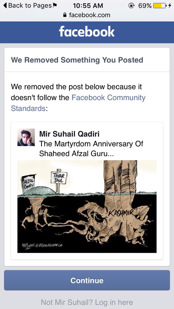 And now Exhibit C. A cartoon by Kashmiri artist Mir Suhail Qadiri, blocked within an hour of it getting posted. Why does the post not follow Facebook Community Standards? Because it talks about how the roots growing from Afzal Guru’s grave in Tihar Jail are connecting to the roots of Kashmir. And because the artist refers to Afzal Guru as Shaheed. Facebook considered it hate speech, and boom! Fair enough. Afzal Guru was a convicted terrorist, an enemy of the state, given death penalty by the Supreme Court of India for the attack on Indian Parliament, and calling him a martyr isn’t really siding with the law of the land. But then again, there could be a set of people who may find the idea of blocking a cartoon depicting a different perspective of a conflict-torn Kashmir not really in sync with the idea of democracy!