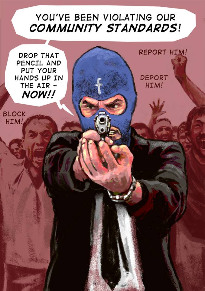 Here’s Exhibit A. Orijit Sen is an established artist. He paints. Sometimes he paints nudes. And, then, sometimes he uploads them on his FB profile. His painting “She came in through the bathroom window…” got reported for nudity, and FB removed the picture. It violated the dreaded Facebook Community Standards. Another friend of Orijit put up the same picture, somebody reported again, and this time, Facebook did NOT remove it because it did NOT violate the Community Standards. The same painting! Encouraged, a third friend also put it up. But in her case, not only was the picture removed, but her account was also suspended for 24 hours! Same painting. Same voice urging the same freedom of expression. Three similar same cases. Three different outcomes. Wow.