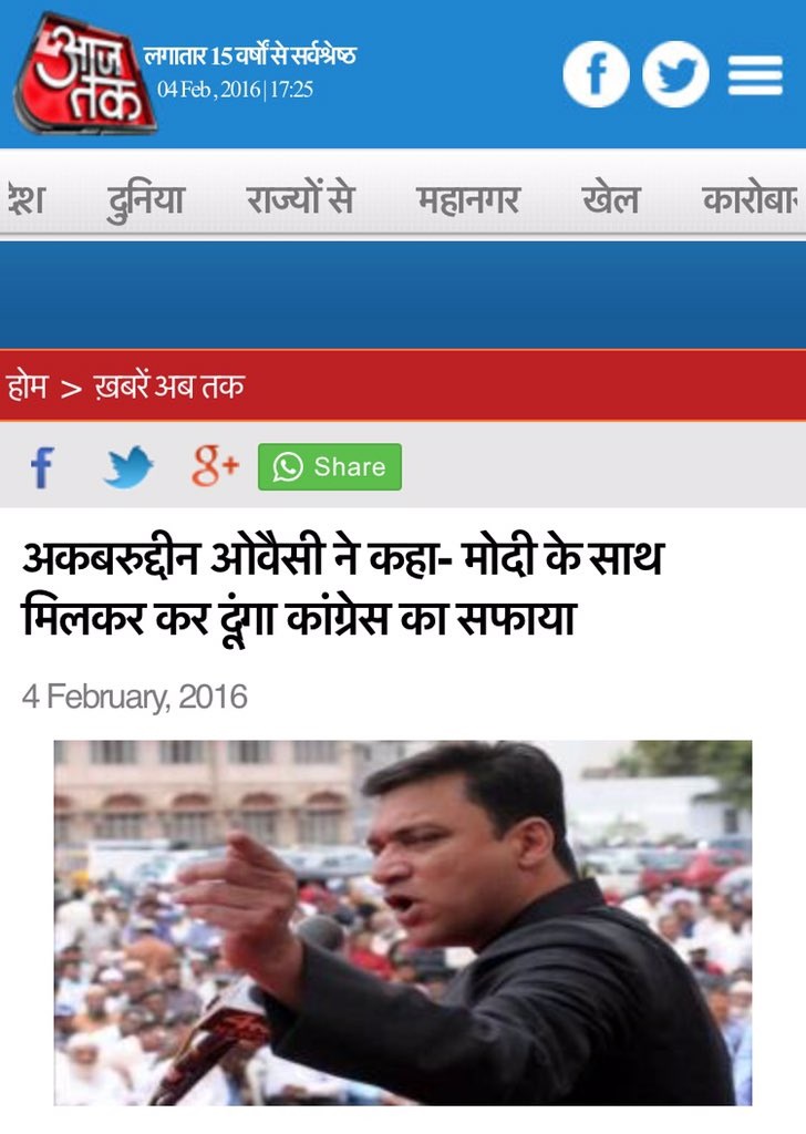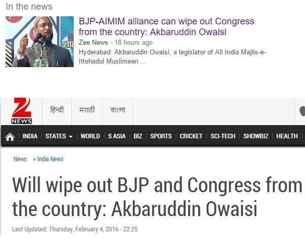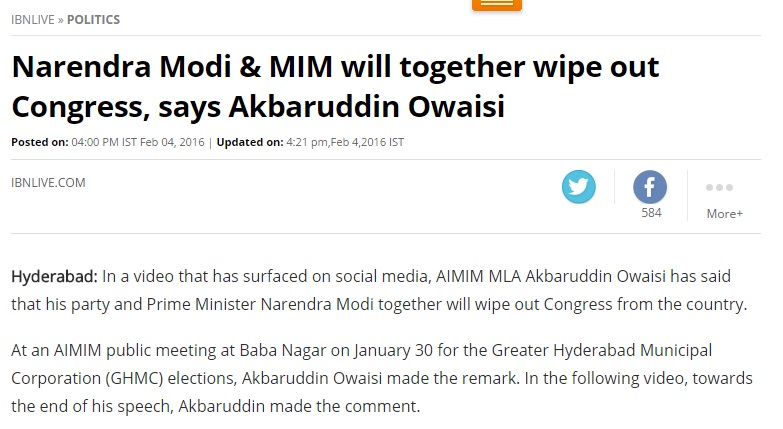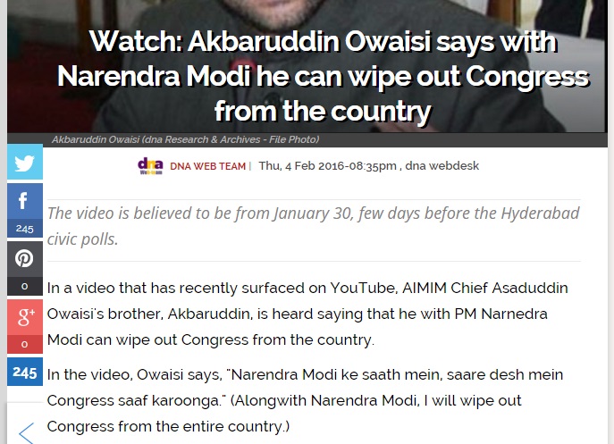 Yesterday a news report was published in multiple media houses which caused a lot of unrest. It claimed that AIMIM MLA Akbaruddin Owaisi had said that AIMIM and Modi/BJP together would wipe out Congress in India. This news that 2 parties from opposing ends of the political spectrum could combine, was met with shock and also anger from supporters.