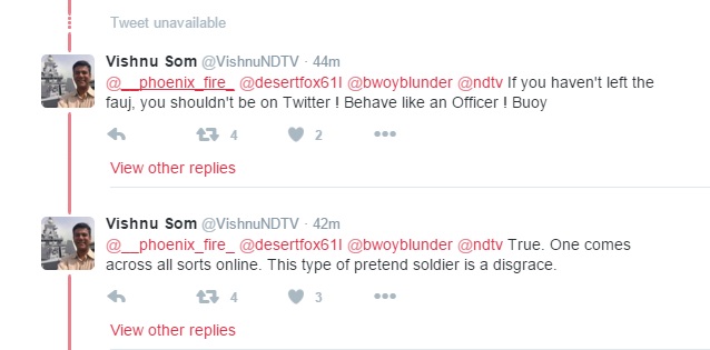 He had addressed this reply to @desertfox61l (whose military affiliations are clear from his bio). Vishnu Som may not have been knowing he was addressing a military veteran. But a reply came from the other tagged account @__phoenix_fire_ :