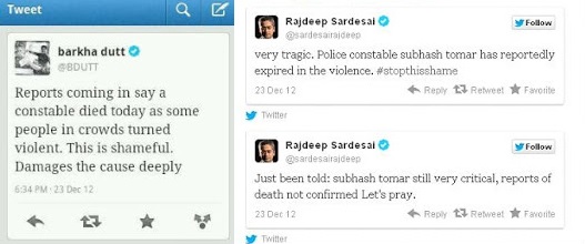 As always, the English TV media focused on what was happening on the streets of Delhi. A constable died, and immediately the English channels went on a rumour spree – that he was killed by mob violence. Leading the tribe was Barkha Dutt (who deleted a tweet), followed by Rajdeep Sardesai.