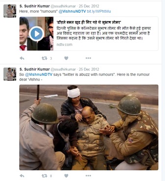 Yes, you read it right. “Abuzz with rumours” merely because it was not fitting into the agenda they wanted to pursue that day. The said journalist is from NDTV (needless to say!), and goes by the name Vishnu Som! I (and many others) have given him proof about these rumours: