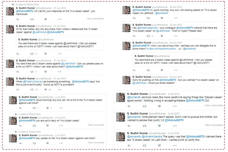 2 dozen = 24. I asked the anchor multiple times as to where I can read details about these 24 cases on NDTV. Any link where I can be enlightened on the 2 dozen cases. I haven’t received a reply till date. The said journalist is from NDTV (needless to say!), and goes by the name Vishnu Som!