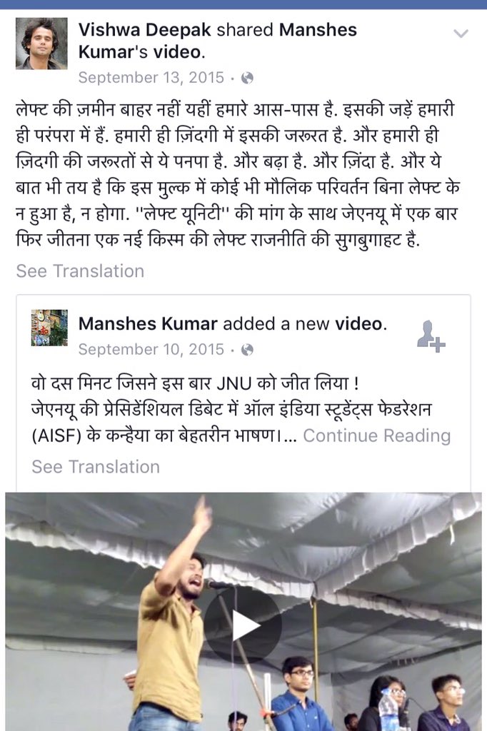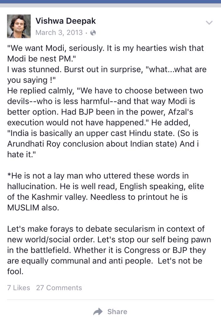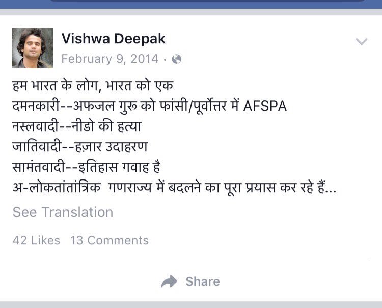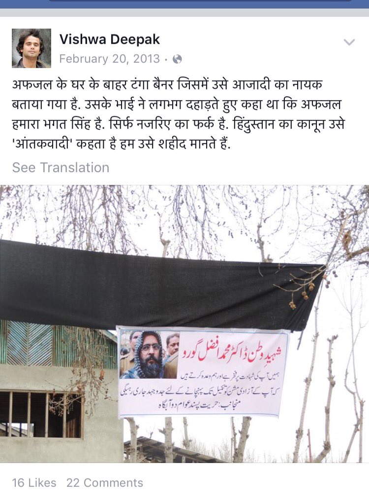However the truth is far from that. A cursory glance at the Facebook profile of the now-resigned reporter is enough to know where his bias and loyalties lay. Vishwa Deepak was yet another Afzal sympathising left leaning person full of visceral hatred against BJP and Hindutva.