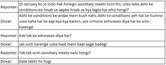 In what Dainik Bhaskar claimed to be an interview with Ajit Doval, Bhaskar claimed that Doval had said Indo-Pak FS level talks had been cancelled. The exact words used by Dainik Bhaskar were: