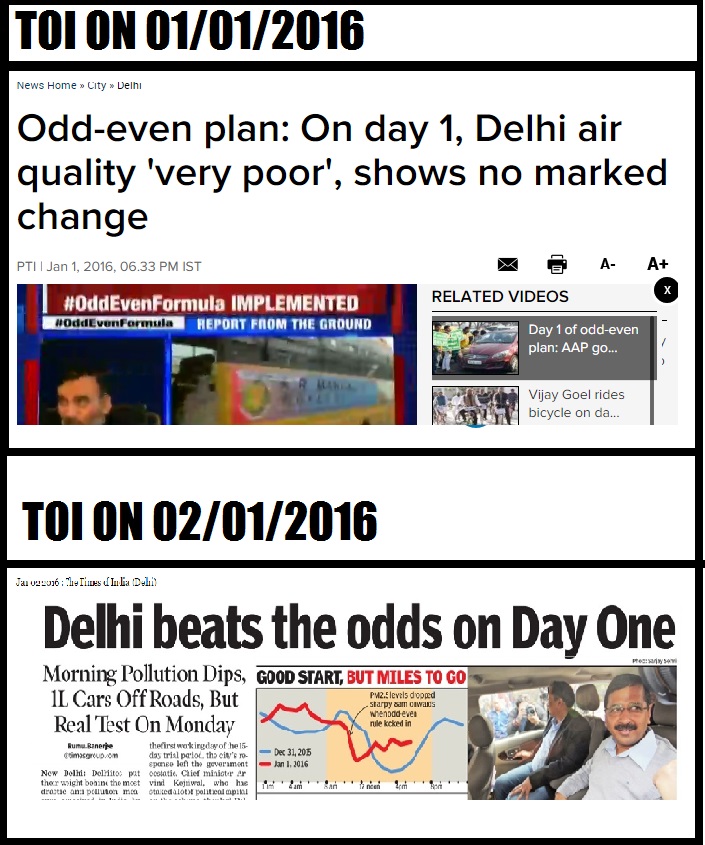 On the morning of 2nd January it self, the above was published on all print editions of Times of India. Within a day it had declared Odd-Even a success, whereas scientific reports of the entire period later revealed that it had failed. What was even more hilarious was just 12 hours earlier, at 6.30 pm on 1st January, Times of India themselves had declared Odd-Even a failure: