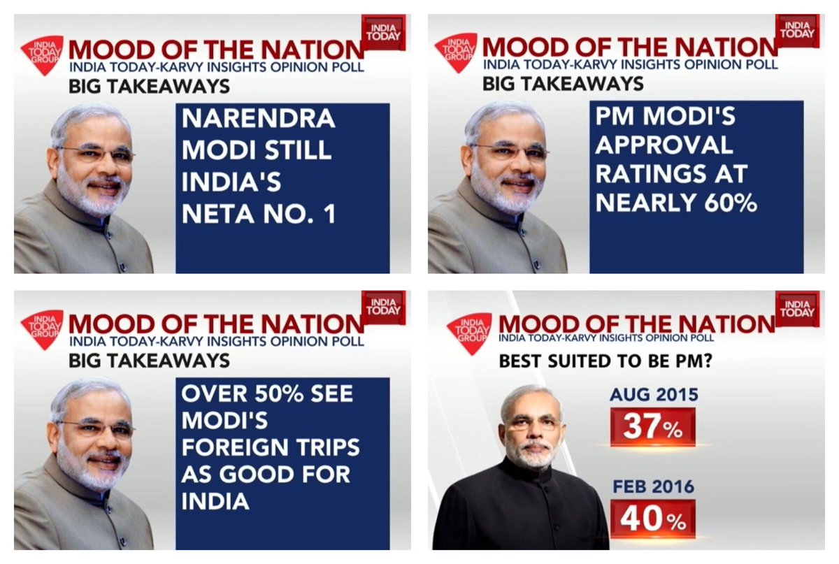 The screen-grab is not dated, but it does say that the survey was conducted by C Voter. If indeed it is a recent survey, then it can only be India Today’s “Mood of the Nation”, conducted in February 2016. But that survey was not done by C Voter. It was conducted by an agency called Karvy, on behalf of India Today. And the results of that survey, are starkly different: