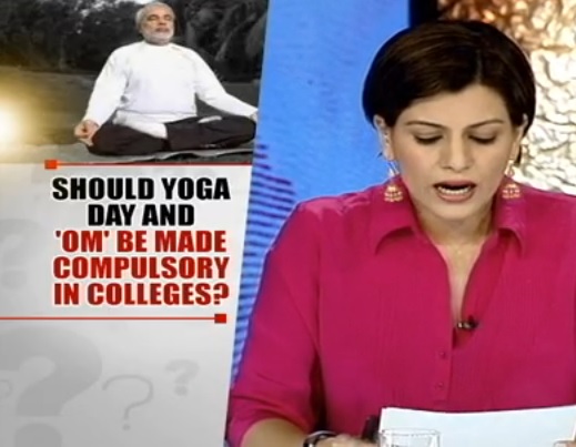 In spite of this clarification, NDTV scheduled a prime-time debate: ‘Om’ Chants In Yoga Day Protocol: BJP’s Mantra Of Controversy? at 8.30 pm, hosted by Vishnu Som. A few minutes into the debate, BJP spokesperson Sambit Patra interjected out of turn, trying to put the facts on record and asked Vishnu Som to read the circular. Som then said: “I am looking at the circular, it doesn’t make anything compulsory, but it suggests…” Patra asked him to show him the place where it is said “Om” is made compulsory. Vishnu Som repeatedly pleaded saying “I have not said that, I have not said that, I have not said that at all”.