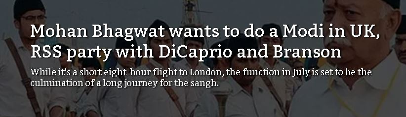 …a gallery of celebrities are set to grace the event and usher in the new uber power and remote control of India. The stars include Sir Richard Branson, adding a virgin touch perhaps with an eye to growing his global empire, English broadcaster and naturalist Sir David Attenborough, and Hollywood superstar Leonardo DiCaprio who will reinforcing the virtues of a beef ban. I have been told that DiCaprio and Branson’s messages have already been received and are on song. DiCaprio is vegan and is expected to provide a touch of stardust to Bhagwat’s anti-beef message. (Perhaps the only thing the two men share in common.) Branson is also vegan and has announced plans to launch a vegan airline. This “cowspiracy” is what the RSS adores about both men and is likely to open doors for Virgin in India.