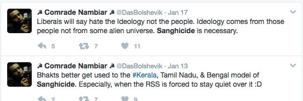 On 13th and 17th January the following tweets appeared on the timeline of well-known Congress leaders and affiliates like Ajay Maken, Priyanka Chaturvedi, Salman Soz, Shehzad Poonawala. The tweets glorified and celebrated the fact that RSS workers are getting killed at the hands of murderous communist mobs in Kerala.