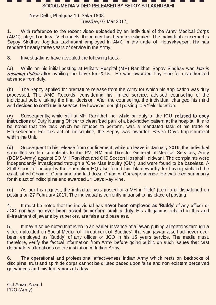 However, it seems that since the issue of sahayaks has been in news of late, he decided to falsely allege that he was being harassed for refusal to function as an officer’s sahayak. The news channel did not even once verify if he was really a sahayak.