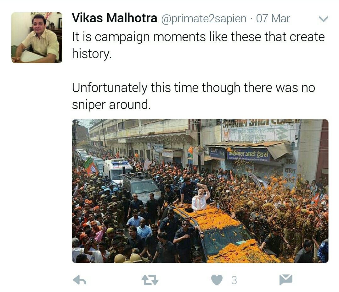 The publication has now given platform to a person who prefers political assassinations to create history. The person is someone called Vikas Malhotra, who wished a sniper to kill Prime Minister Narendra Modi when he was campaigning in Varanasi. This is what he had tweeted:
