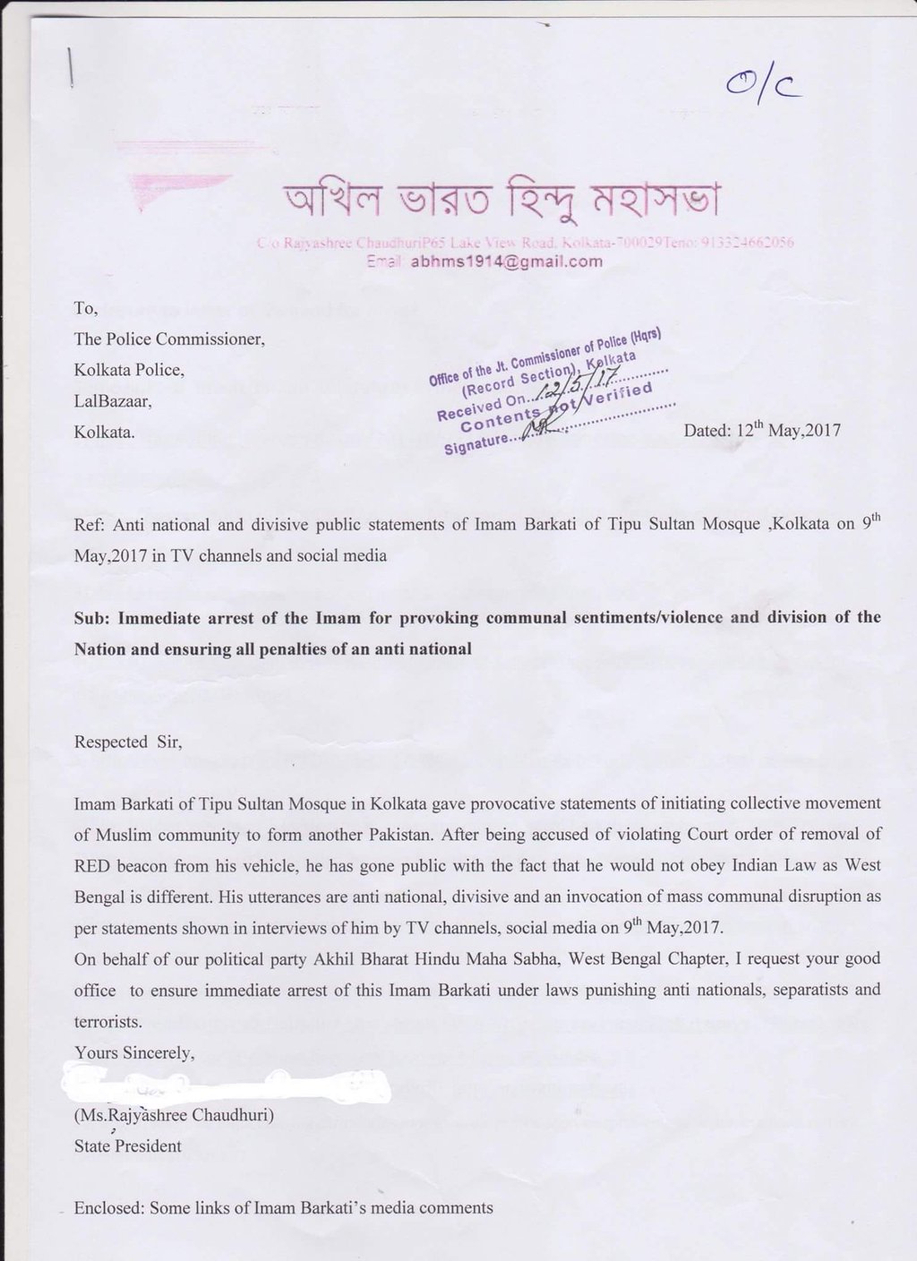 Another FIR was filed on 11th May at Gariahat police station by some common citizens of Kolkata. The FIR detailed all the allegations against the Imam which are in the public domain. The citizens claimed that they were terrified of his hate speeches and feared a Kashmir like situation in Bengal. The citizens also claimed that Imam Barka was trying to create riots in the country.