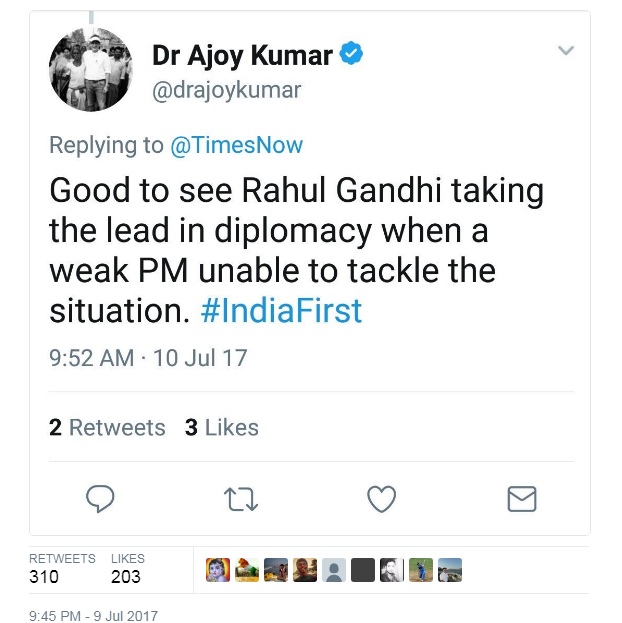 //platform.twitter.com/widgets.jsHowever, things were muddled when Dr Ajoy Kumar, another spokesperson of the Congress, replied to a Times Now tweet on Rahul Gandhi-Luo Zhaohui meeting, which suggested that the meeting indeed took place. However, he deleted the tweet, possibly as the official Congress line was to deny any meeting.