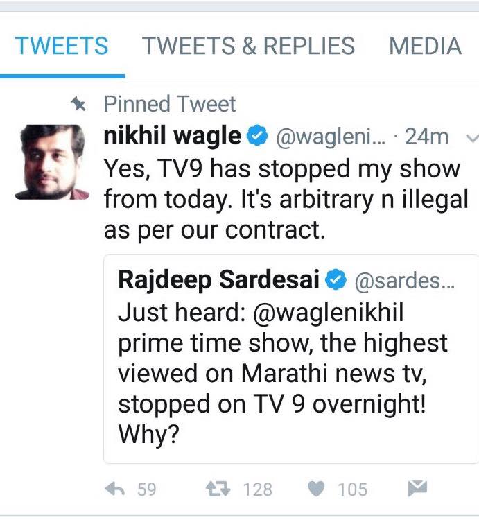 Last week, television journalist Rajdeep Sardesai had tweeted that a ‘highest viewed’ TV news show in Marathi, hosted by another journalist named Nikhil Wagle, had been stopped ‘overnight’ by Marathi news channel TV9: