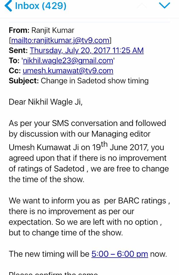 To back his claims, Vinod Kapri even uploaded a screenshot of the email sent by the channel to Nikhil Wagle, which informed him that his show timings were being changed due to poor TRPs. So technically, the show was not stopped, but just shifted to a different time slot: