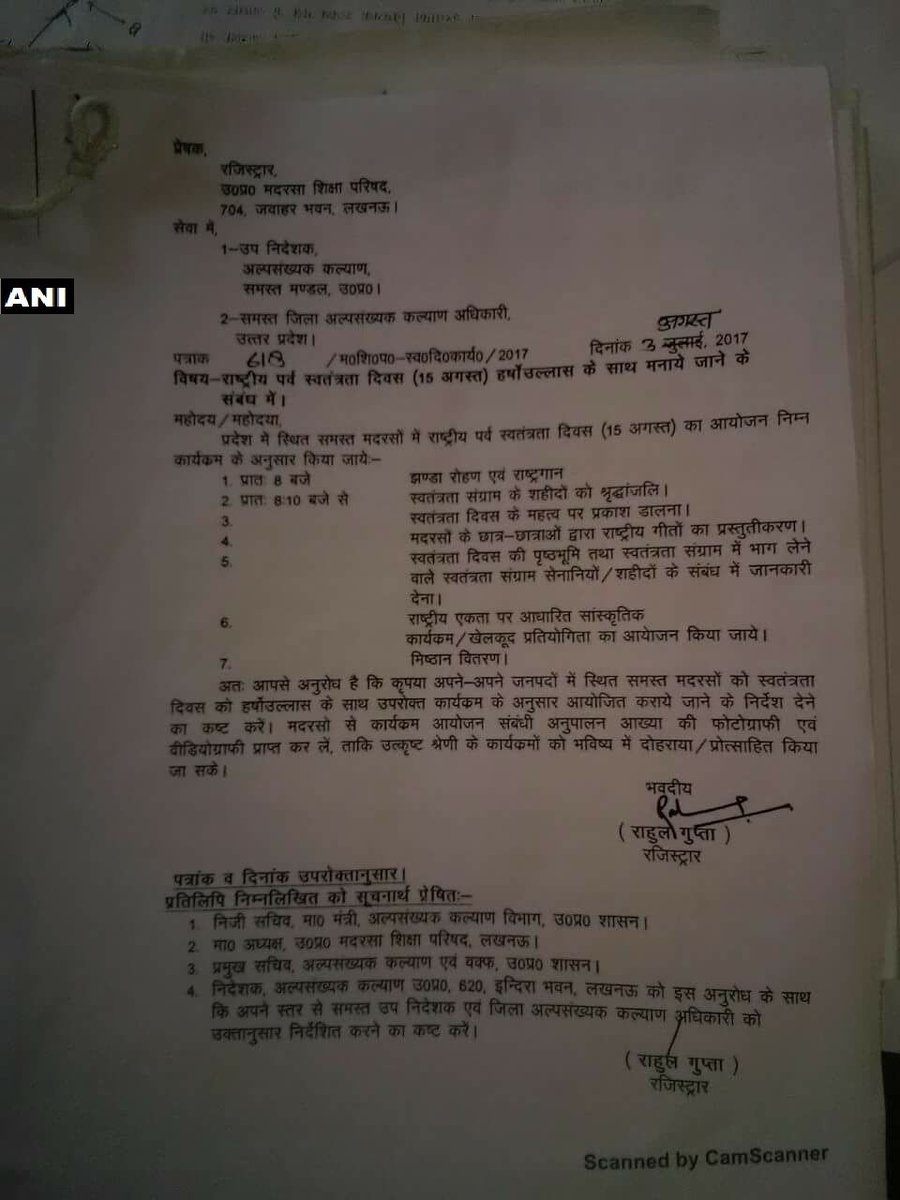 Following the footsteps of UP, even Madhya Pradesh Madarsa Board issued advisory to celebrate the Independence Day and send photographs of the celebrations. MP Madarsa board chairman, however, said that the order was a routine order to celebrate the Independence Day