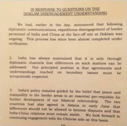 Oh, one more thing. With Doklam successfully demilitarized, a small group back home in India has lost face as well. I will not name them, because they know well in their hearts who they are. But they are welcome, as always, to celebrate our national achievement.