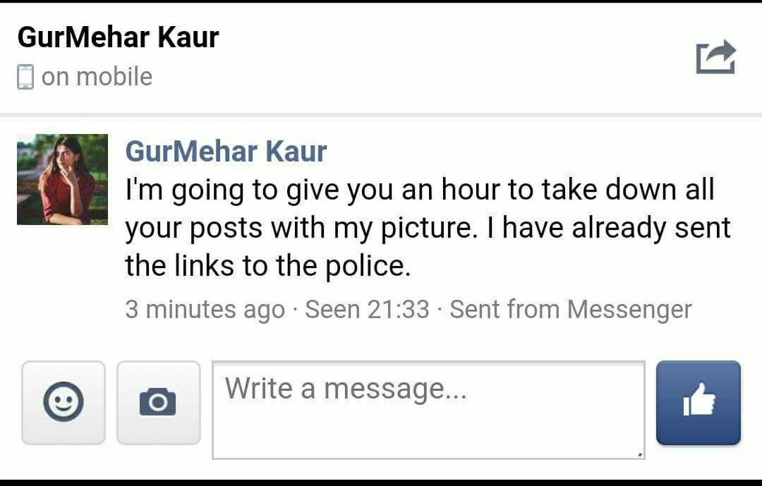 The admins – boys younger than Gurmehar – decided to go public with this ‘threat’ of Gurmehar and posted the following update on their page (now unavailable), rightly pointing out how a girl – who was painted as an icon and champion of free speech by the media – was now using various means to curb the freedom of expression of others: