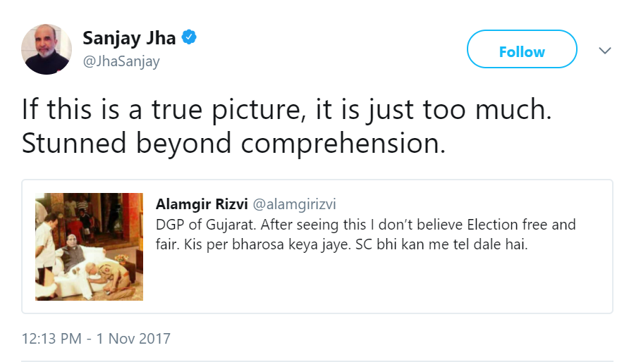 Earlier today, Jha circulated a picture on Twitter, which showed someone purported to be the DGP of Gujarat Police, kneeling down to senior BJP leader and Union Home Minister Rajnath Singh.