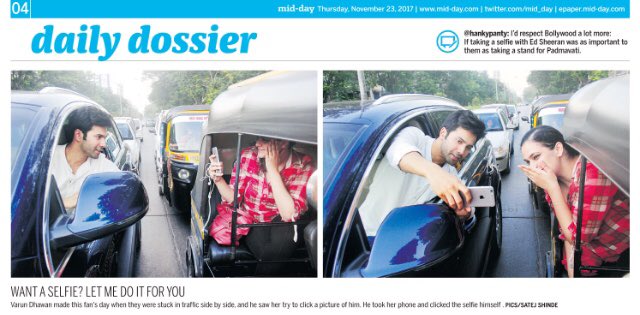 Today, Mumbai Police took actor Varun Dhavan to task for a picture of him published in a paper which showed him taking a selfie with a fan in middle of the road at a traffic signal. The picture was published in the tabloid Mid-day, which showed Dhavan obliging a visibly excited fan in an autorickshaw next to his car by stretching out of his car and taking a selfie.