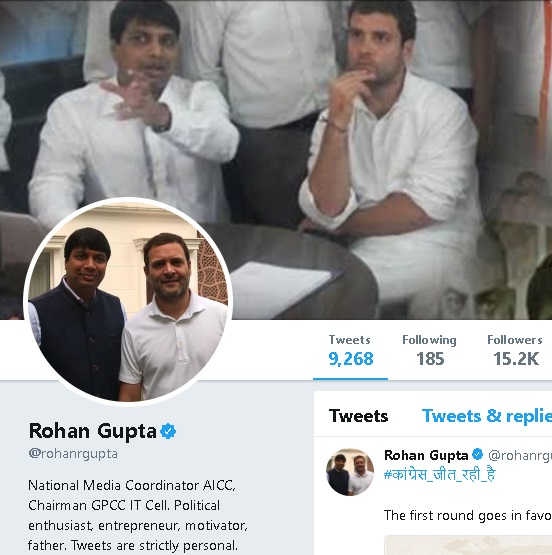 Rohan Gupta is no ordinary twitter user. As per his bio, he is the National Media Coordinator AICC, Chairman GPCC IT Cell. Further, he uses his twitter ID to flaunt his closeness to the soon-to-be President of Congress, Rahul Gandhi:
