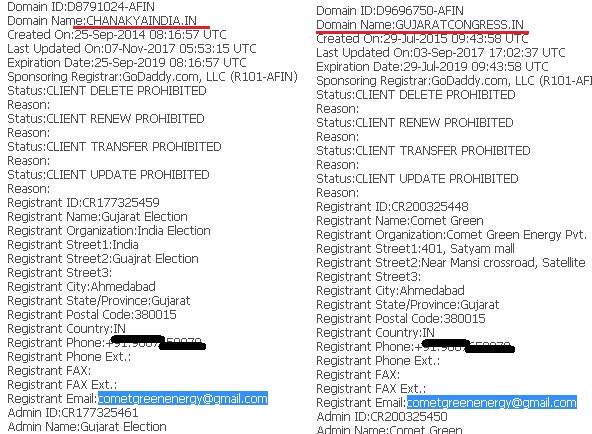 While the credibility of the so called “survey” was now exposed, Nakhua decided to check who owned the site. He found out that chanakyaindia.in was registered with the email id [email protected]. And this email ID, was also associated with the site gujaratcongress.in.