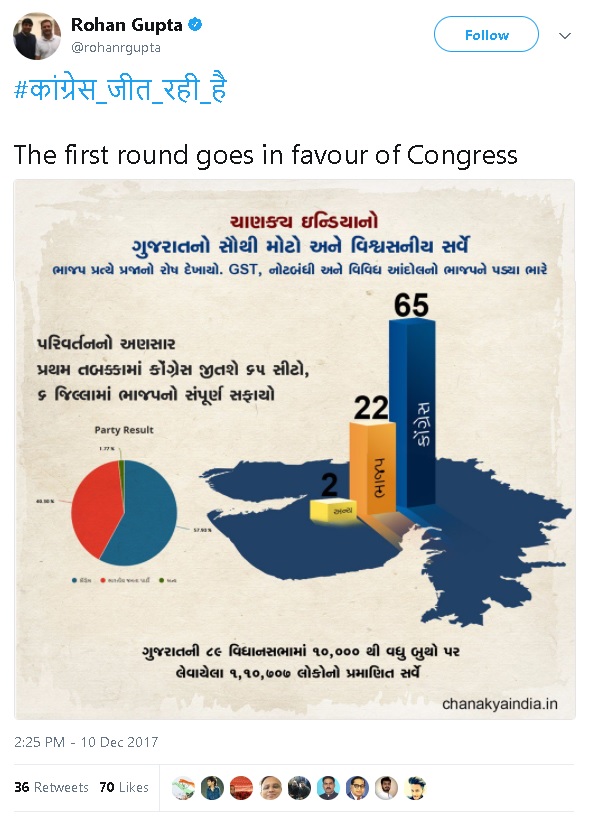 BJP spokesperson Suresh Nakhua took to Twitter to expose a calculated move to spread misinformation. Nakhua found that a person by name Rohan Gupta, had shared a survey of the polling done in the first phase of Gujarat, which showed Congress winning 65 seats.