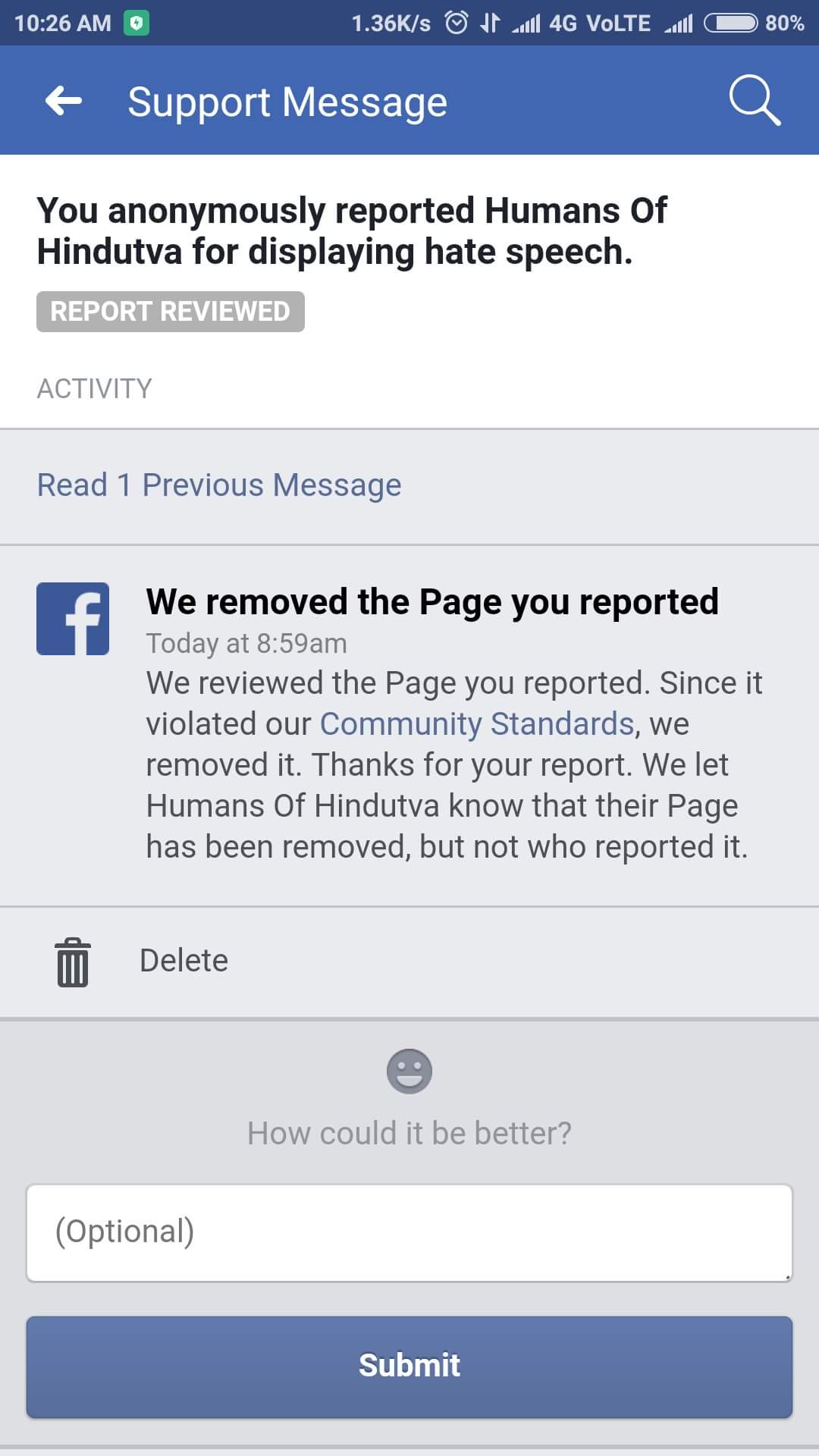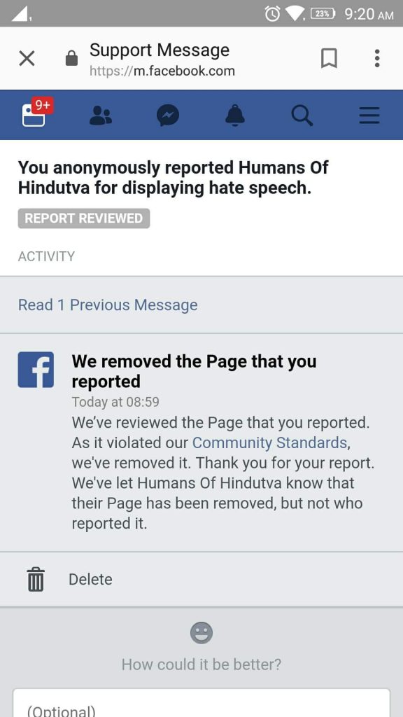 However, there seems to be a twist in the tale as it seems Facebook removed the page since the hate page was violating community guidelines. Many users who had mass reported the page for hate speech, claimed to have received an update from Facebook stating that the Humans of Hindutva page they had reported was found violating community guidelines and hence it has been removed.