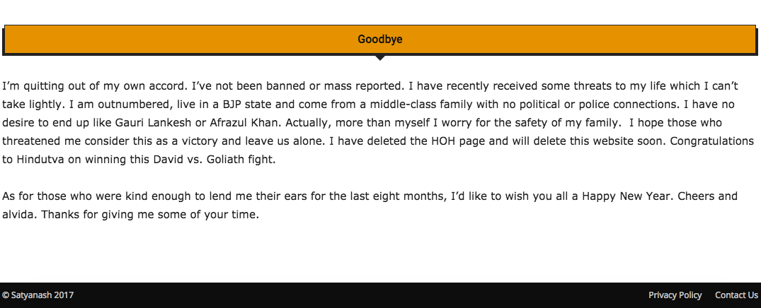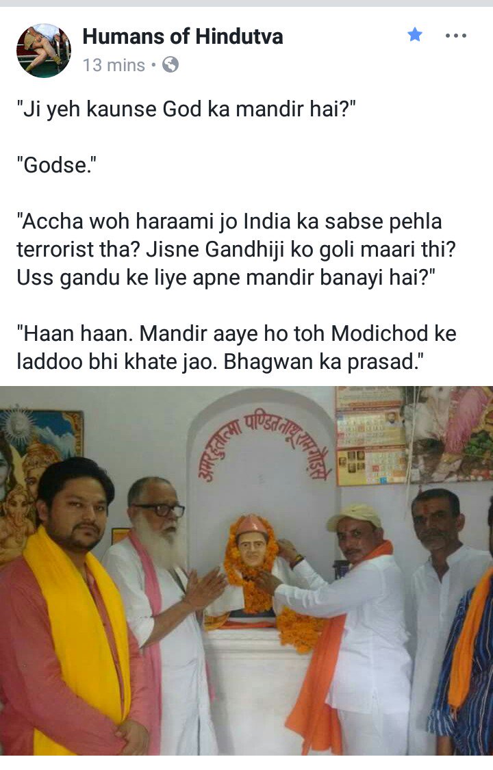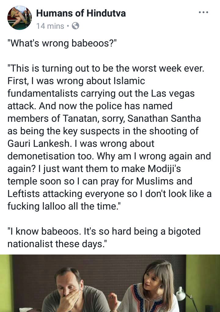 Had a brief chat with my friend who runs the Humans of Hindutva page. He told me that trolls have got a hold of his phone number and they’re sending him death threats. He’s scared for his wife and children, so he’s shut the page for now. The nation can’t take a joke.