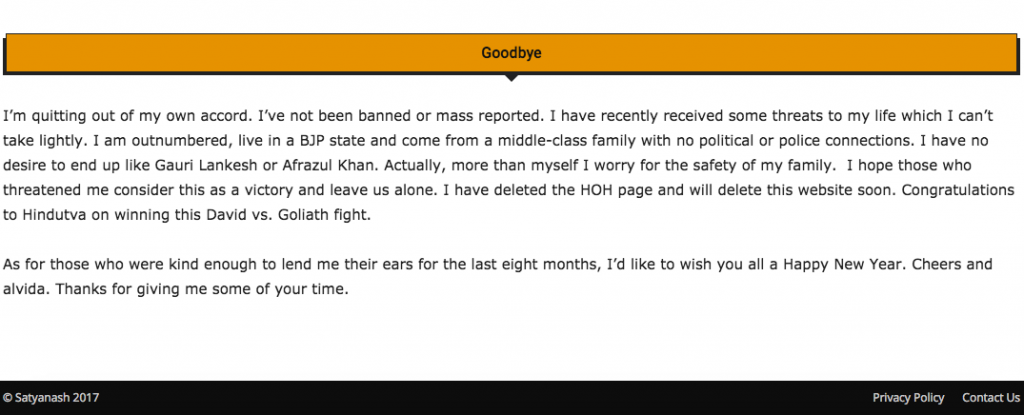 However, the admin of the page, who chooses to remain anonymous, is claiming that he deactivated on his own accord as he ‘fears for his life’ and ‘does not want to end up like Gauri Lankesh or Afrazul Khan’.