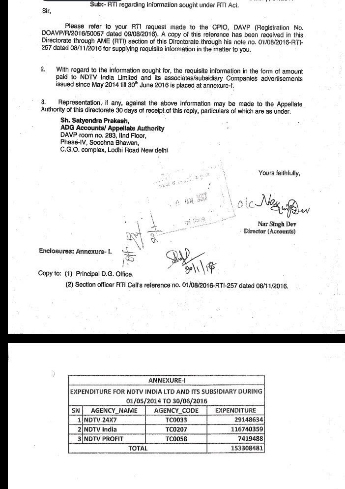 This claim by Sonia Singh comes just weeks after social media users had outraged over the alleged partnership of NDTV and Niti Aayog. Niti Aayog had rebutted the charge but rather unconvincingly. The claim also does not seem valid at least for the period ending 30th June 2016. As per an RTI reply, The Government of India had paid a whopping Rs 15.33 crores as advertisement expenditure to NDTV and its group companies from 01/05/2014 to 30/06/2016. It is not known if anything had drastically changed since then: