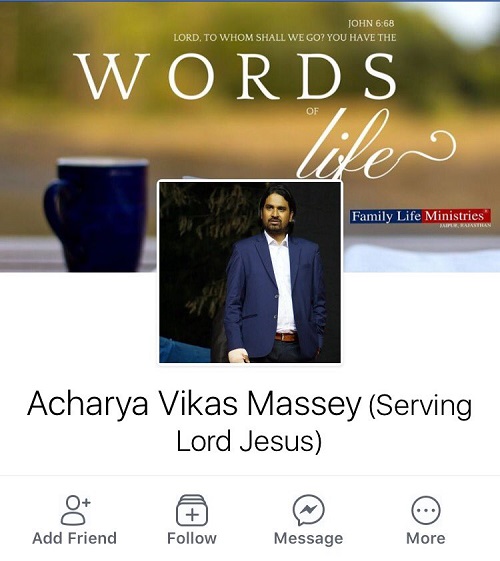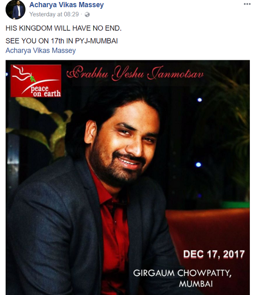 As per the poster, the event features the Hillsong church and an Acharya Vikas Massey. Going to the Acharya’s Facebook page, one sees that he openly clams to serve Jesus: