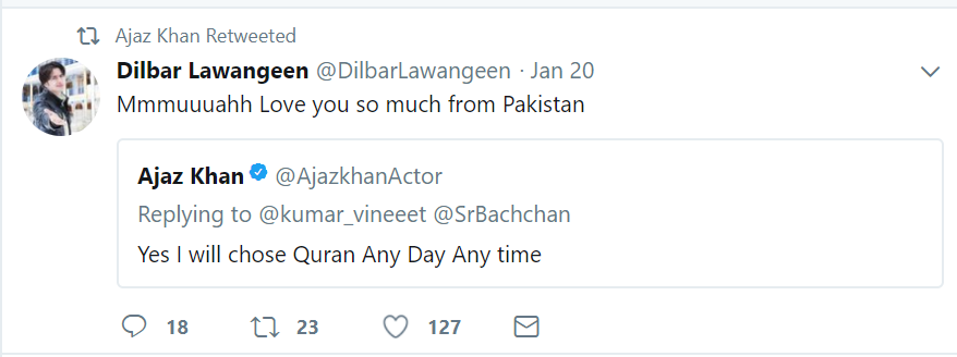 Soon enough support poured in from Pakistan and #IStandWithAjazKhan was also trending on Twitter (as per Ajaz’s claim on his Twitter page). It is also noteworthy how Ajaz gleefully retweeted the tweets from Pakistan supporting his stand of choosing the Quran over the Constitution, thereby undermining the sovereignty of India for religion: