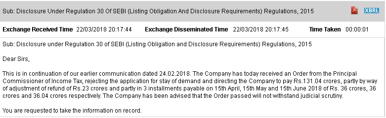 The filing by NDTV stated that the company had received an order from the Principal Commissioner of Income Tax, rejecting the application for stay of demand and directing the Company to pay Rs. 131.04 crores, partly by way of adjustment of refund of Rs. 23 crores and partly in 3 installments payable on 15th April, 15th May and 15th June 2018 of Rs. 36 crores, 36 crores and Rs. 36.04 crores respectively.