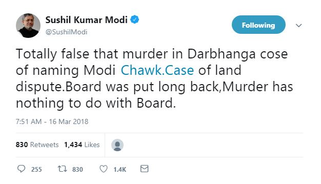 The police authorities and the deputy CM of the state Sushil Modi, however, had denied that the murder was result of naming of the chowk: