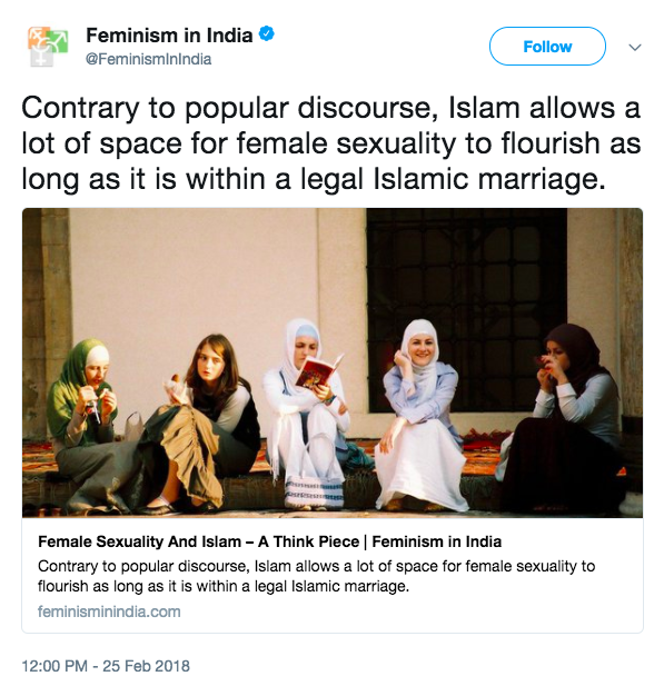 And when they are not busy painting Hinduism as oppressive, women-hating religion, they spend their spare time painting Islam as the most women-friendly religion, which is paragon of feminism: