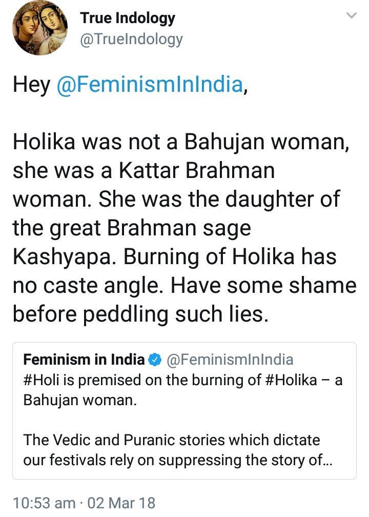 Secondly, a bit of a research would have revealed to her that Holika was not a Bahujan, but a Brahmin – a community that is ‘liberally’ maligned as oppressors of the Bahujan people (a vague term that will include OBCs when convenient, but the same OBCs will become ‘upper caste’ when they are at odds with Dalits).