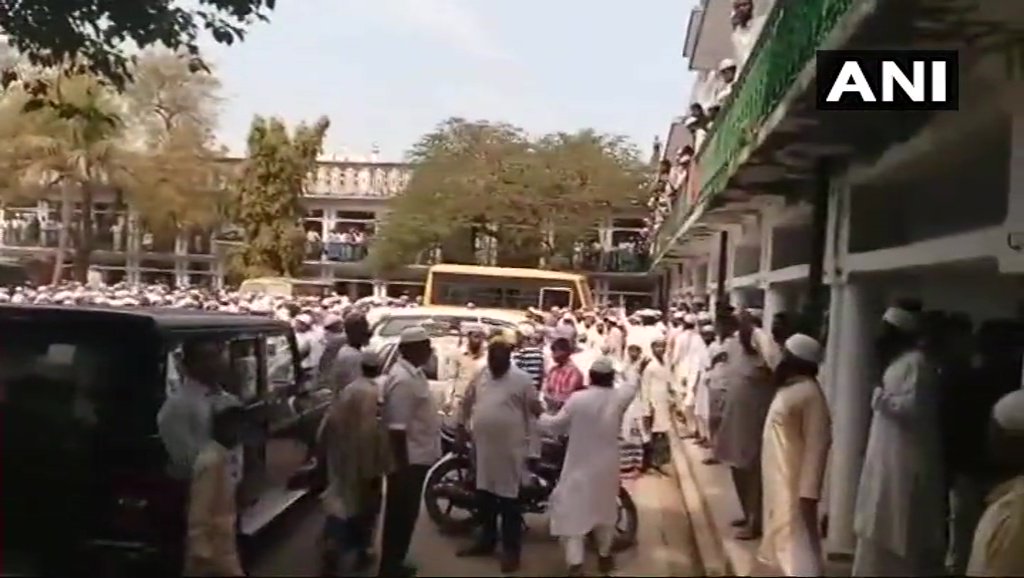 As per images of the raid tweeted out by ANI, one can see a huge crowd of madrasa inhabitants crowding the courtyard of the property: