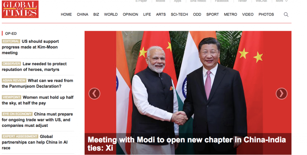 Global Times, an English-language Chinese newspaper with focus on international affairs, featured Modi-Xi news prominently on their home page:
