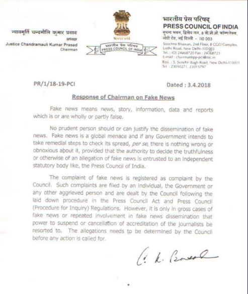 In the light of these developments, the chairman of PCI (press council of India), Justice Chandramauli Kumar Prasad has issued a statement/response to the fake news. He has said that there is nothing wrong in government taking initiatives to curb fake news provided that the authority to examine complaints and punish is given to an independent body like PCI.