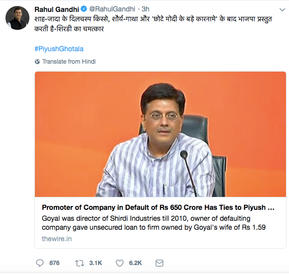 In fact, if one takes a closer look at the financials of Shirdi Industry, one would realise there was no outstanding SBI loan in the books of Shirdi Enterprise when Piyush Goyal became the Director in 2008. How then is an insinuation of conflict of interest made? Or did Rahul Gandhi not read the article at all?