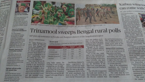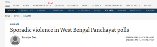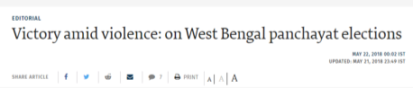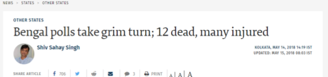 The benchmark is 40 deaths in 2003 when the Left Front is ruling. And because that benchmark hasn’t been breached yet, perhaps The Hindu was ok to classify the deaths of 32 people as “grim”. But come results day, the situation was no longer “grim”. A report was published on May 17th, and guess what – there is NO mention of any “grim” violence. In fact, there is NO mention of even “sporadic violence”.