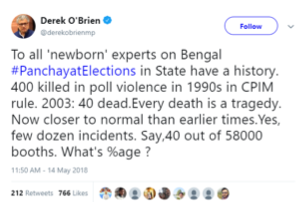Now, this made me even more curious. Because this line meant that the violence before 2011 was much higher, when the harbinger of peace, the Left parties were ruling the state! In the previous elections of 2008, 2003 etc, there was actually no social media (or it was in its budding stages). A quick google search yielded this article of The Hindu that said 14 people were killed in the 2003 violence in West Bengal. Not 40 as Derek O’Brien claimed. About 3 weeks after this article, we are told in an Op-Ed in the same newspaper, The Hindu that according to another newspaper (phew!) Anand Bazaar, 47 people were killed! Why is it so difficult to get an official version of the numbers? A 2008 report in Times of India tells us that 30 people were killed in Panchayat violence in 2008, “making it the bloodiest in Bengal’s history, surpassing even the 2003 death count.”