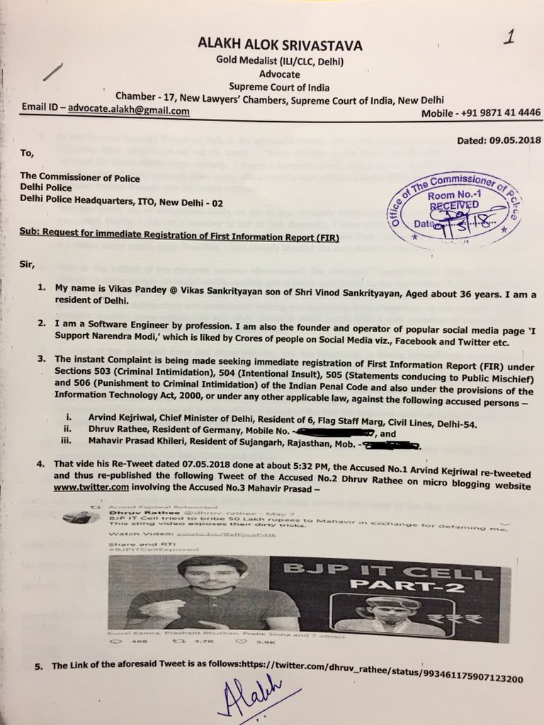 A police complaint has been filed by Advocate Alakh Alok Srivastav on behalf of software architect and BJP volunteer Vikas Pandey, against Aam Aadmi Party chief Arvind Kejriwal and conspiracy theorist and AAP supporter Dhruv Rathee, for accusing Pandey of offering a bribe to one Mahavir Prasad.