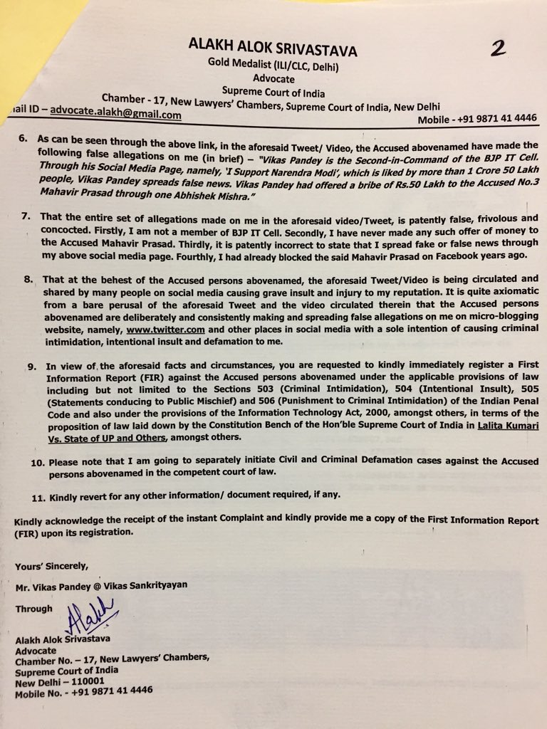 The complaint states that the information shared by Rathee and Prasad is false and is causing harm to his reputation. That the accused are deliberately spreading false allegations on various social mediums with the sole intention of ‘causing criminal intimidation, intentional insult and defamation’ to Pandey.
