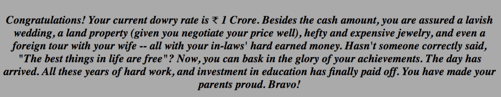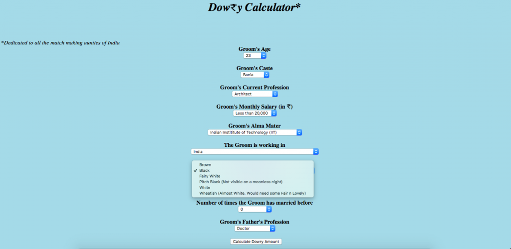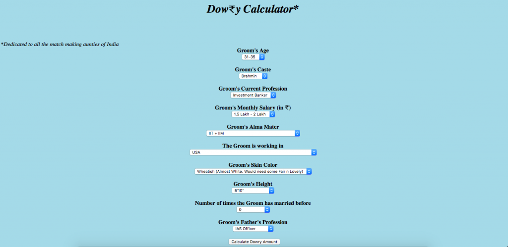 As a joke, we put in details of a fictional groom in the ‘dowry calculator’.
