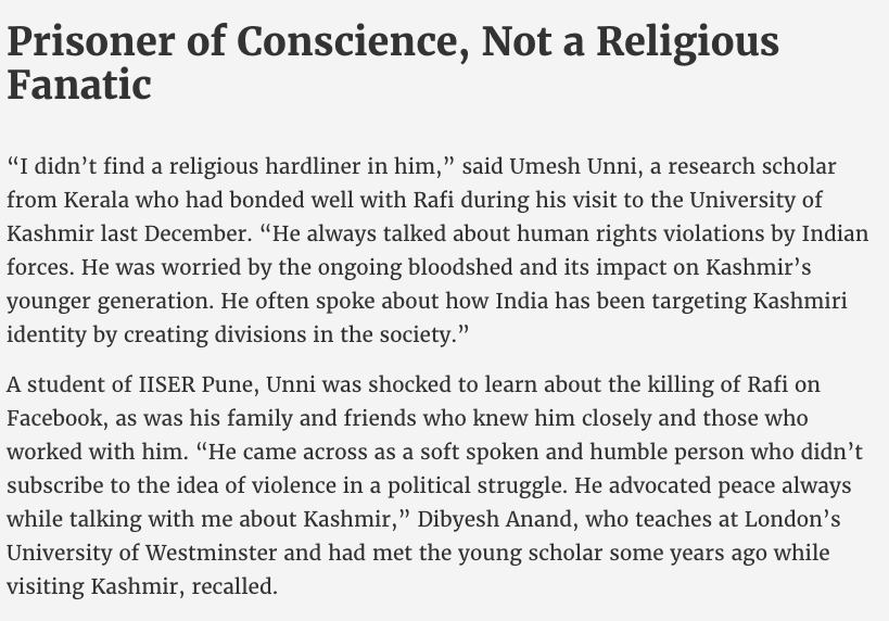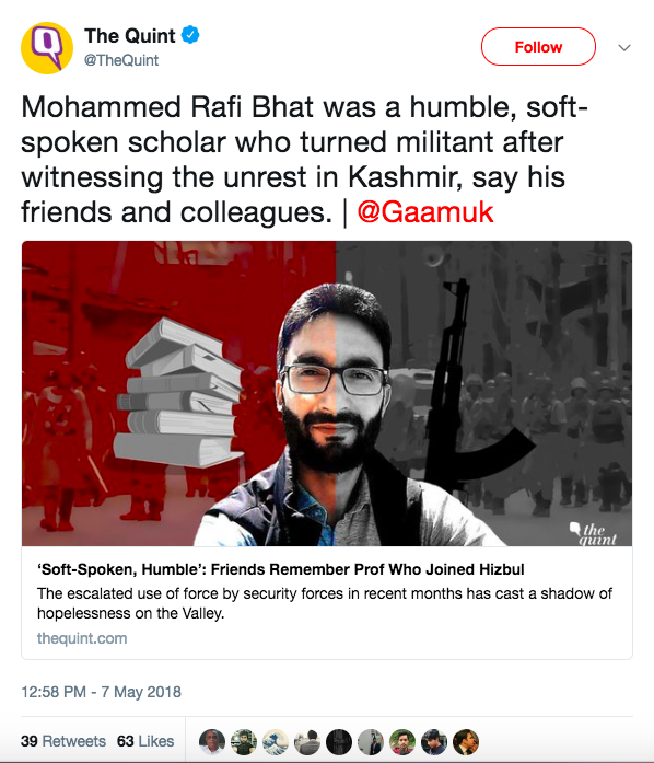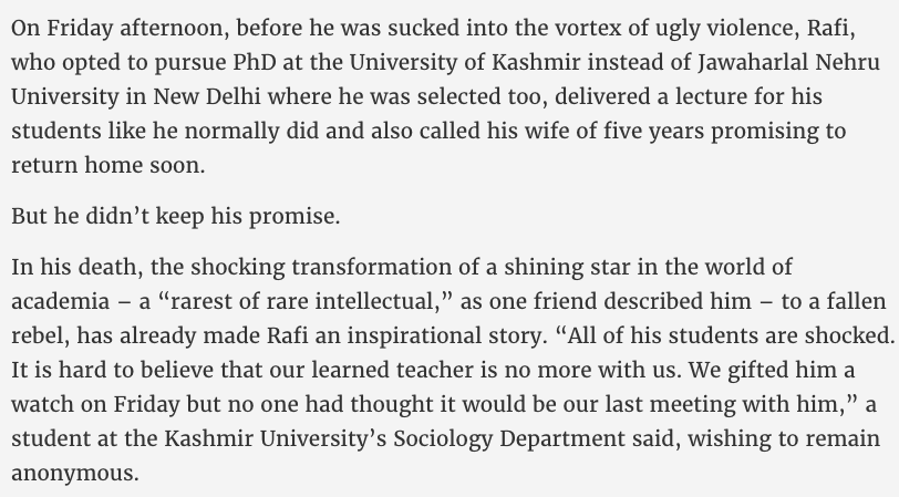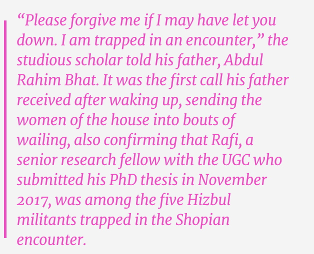 Propagandist TV anchors will swoop down on Dr Rafi Bhat’s “anti-nationalism”, but unless we break away from this binary of hate, and begin to understand the desperation that is pushing even PhD scholars to take to arms, Kashmir will continue to bleed. https://t.co/rC4DNRs29e