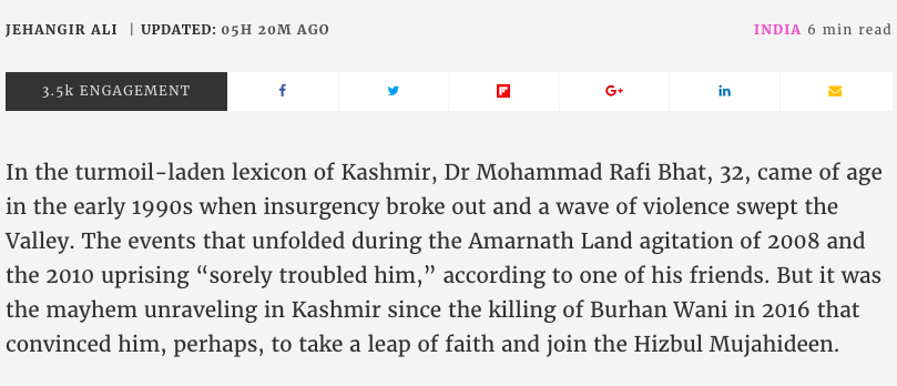 The article goes on to state how growing up in Kashmir, he witnessed violence which ‘sorely troubled him’ but the neutralization of Burhan Wani (armed terrorist touted as headmaster’s son by “eminent journalist” Barkha Dutt) by security forces was perhaps the last straw.